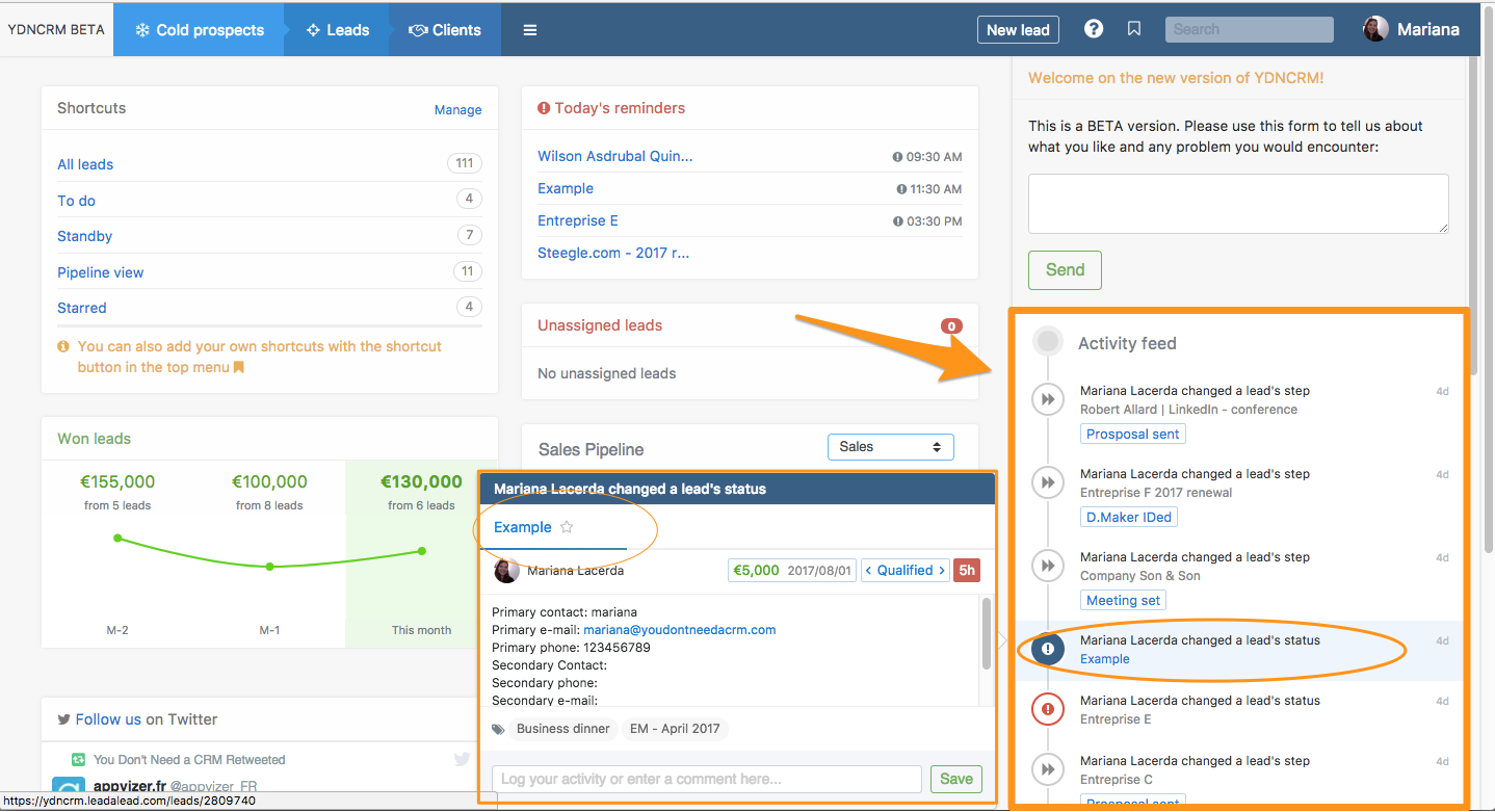 Using the Activity feed of your no crm.io account will enable you to micro-manage your team and know what are the latest leads your sales team has been working on. You can easily go through them and comment on them, to congratulate or give advice on how to proceed during the next phase.