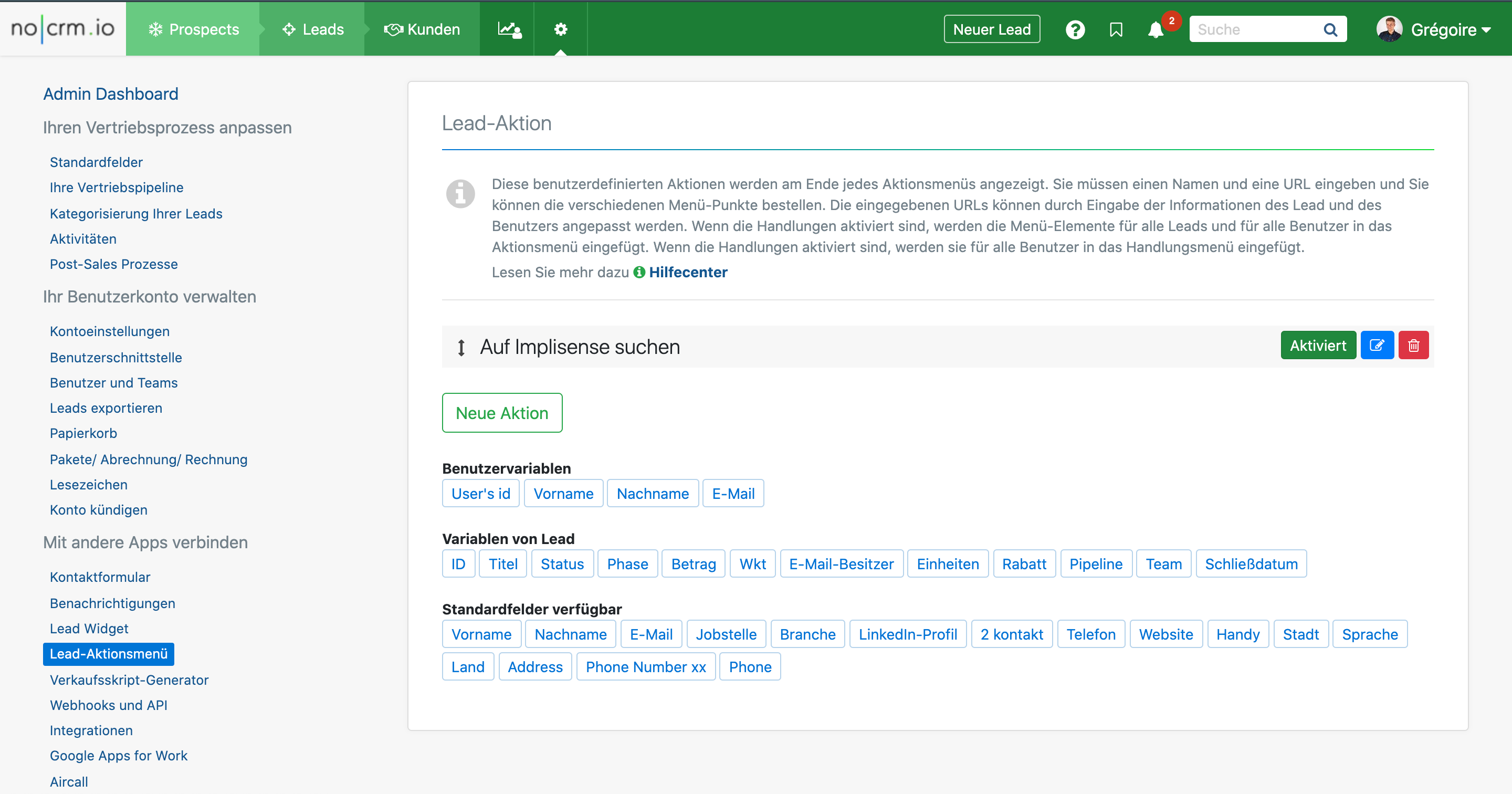 - Klicken Sie auf die grüne Schaltfläche "Neue Aktion". Benennen Sie die Aktion nach Ihren Wünschen, zum Beispiel "Auf Implisense suchen" und fügen Sie den folgenden Link hinzu: https://implisen.se/