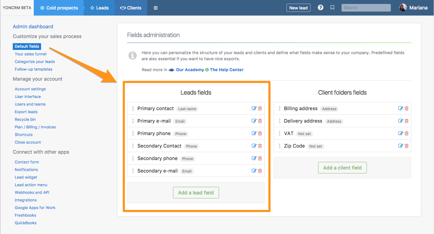 Wenn Sie bereits Leads erstellt haben, die nicht alle gewünschten Standardfelder enthalten, können Sie die Felder auch mit einem Klick hinzufügen: