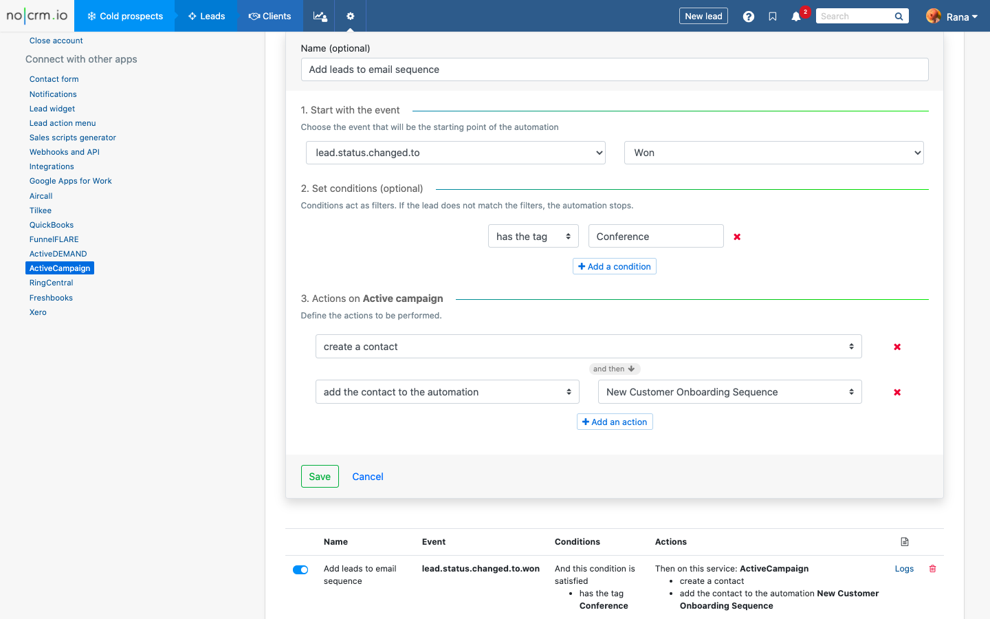 La creación de una regla te permite seleccionar qué evento de lead en Pro Pipe Lines desencadena una acción o acciones automatizadas en ActiveCampaign. También puedes agregar condiciones que actúen como filtros para que si el lead no coincide con los filtros, la automatización se detenga.