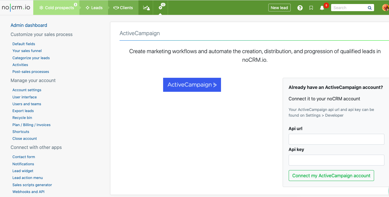 Inicia la integración haciendo clic en Conectar mi cuenta de ActiveCampaign y luego ingresa tu URL y clave de API. Puedes encontrarlos en tu cuenta de ActiveCampaign yendo a Configuración> Desarrollador.