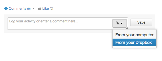 Si necesitas anexar un documento que esté en tu Dropbox al comentario de un lead, haz click en el icono dentro del campo del comentario de un lead y elige Dropbox como fuente del documento.