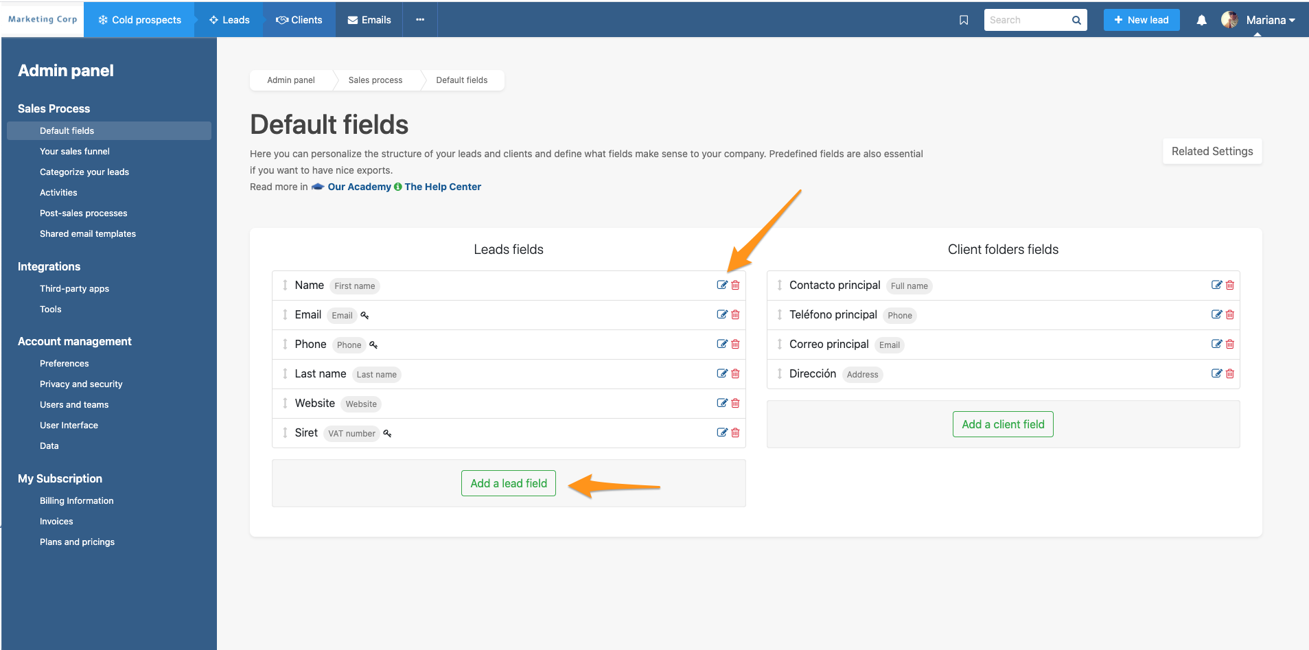 Ve al Panel de administración> Proceso de ventas> Campos predefinidos y comienza a crear tus campos.