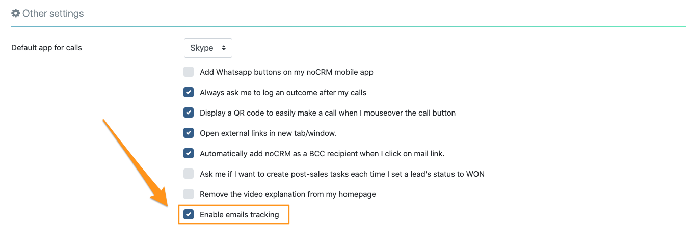 Nota: Puedes desactivar las notificaciones para el seguimiento de correos en todo momento desde tu Configuración de usuario y Preferencias > Otras configuraciones, desmarcando la casilla 'habilitar seguimiento de correo electrónico'.