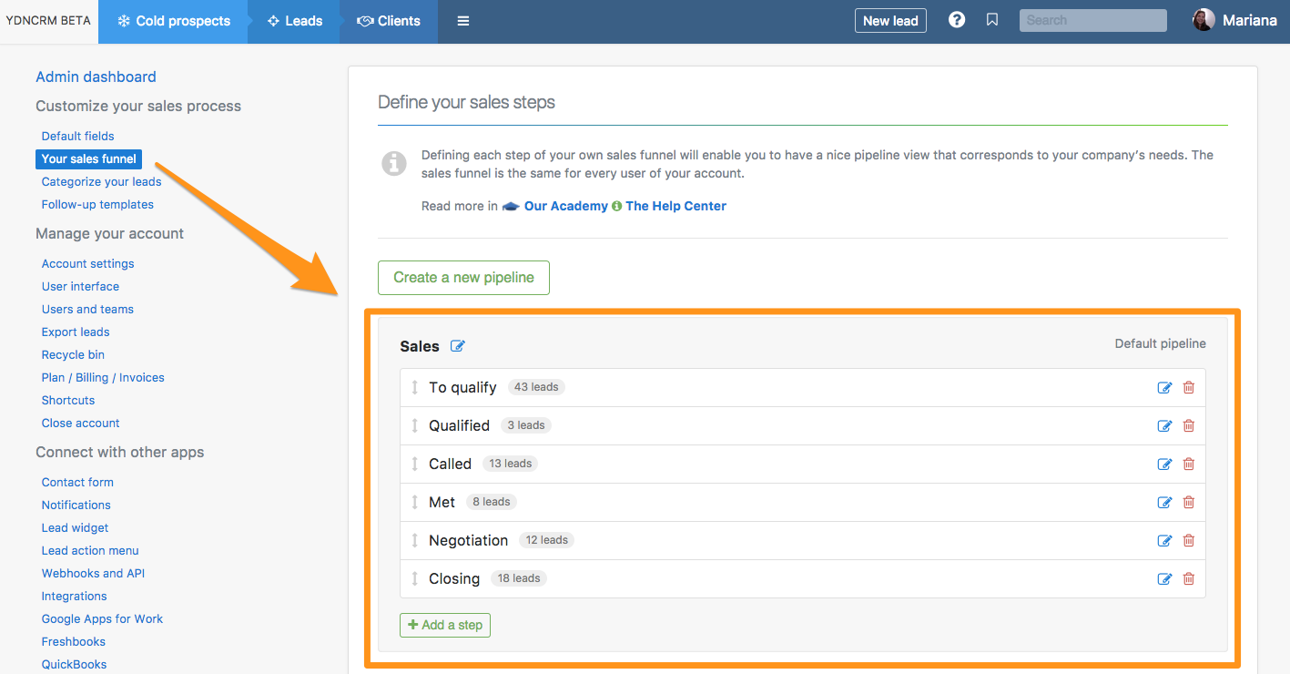 Puedes organizar tus etapas moviéndolas con la flecha a tu izquierda. A la hora de crear un nuevo lead, la primera etapa te será asignada automáticamente.