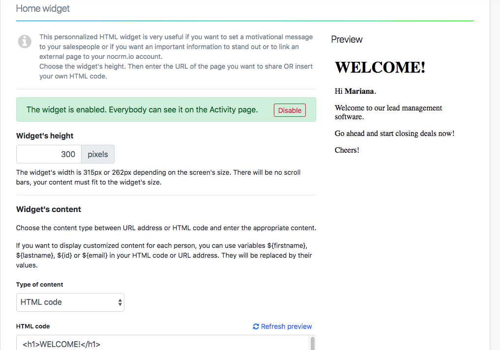 Gracias al widget personalizado dentro de tu cuenta no crm.io, los administradores podrán crear su propia zona de texto para transmitir información importante a su equipo, definir los objetivos estipulados para ese mes o semana, o incluso hacer con que una página web externa sea más fácilmente accesible.