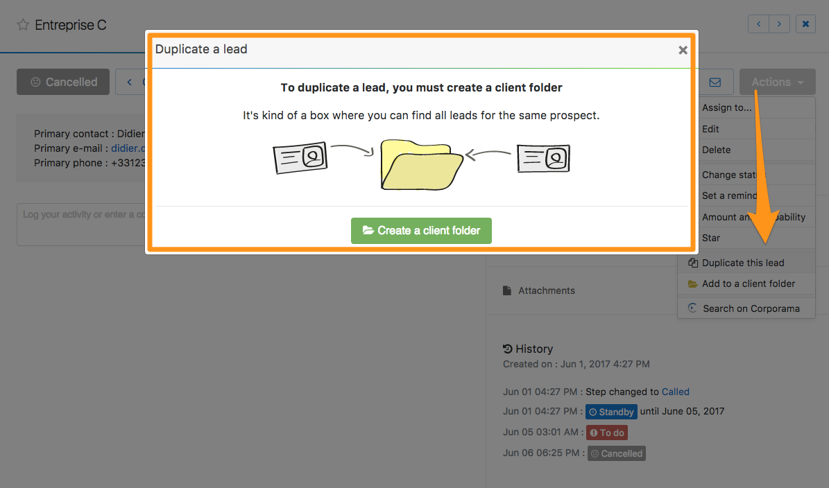 La façon la plus simple d'utiliser le Dossier Client est d'utiliser Dupliquer cette opportunité dans le menu Actions d'une opportunité. Après avoir cliqué, le système vous proposera de créer le Dossier Client correspondant avant de créer la nouvelle opportunité.