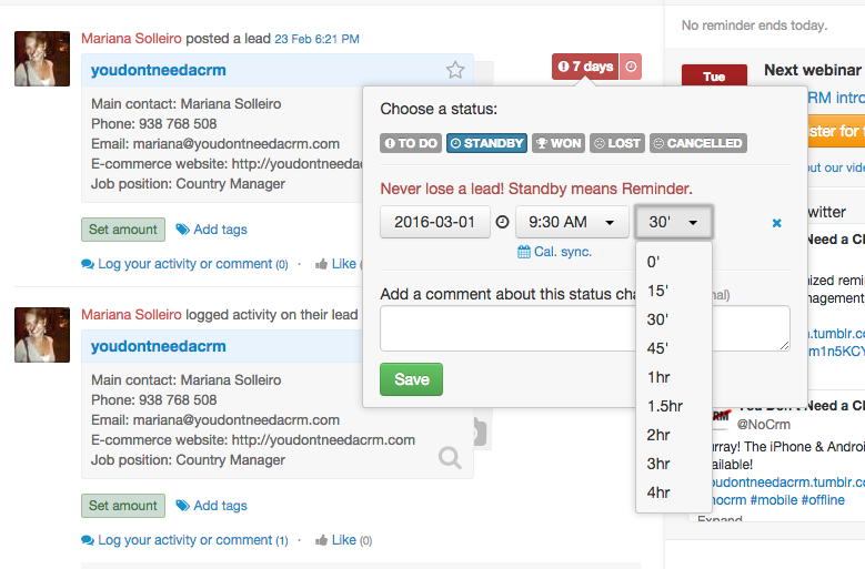When you look at your active leads you will now be able to know in how long you’ll have to work on a lead, but also to know how behind schedule you are with a lead. In fact, not only will the status be To-Do, it will also say for how long it has been in the To-Do folder (1 hour, 3 days, 20 days…).