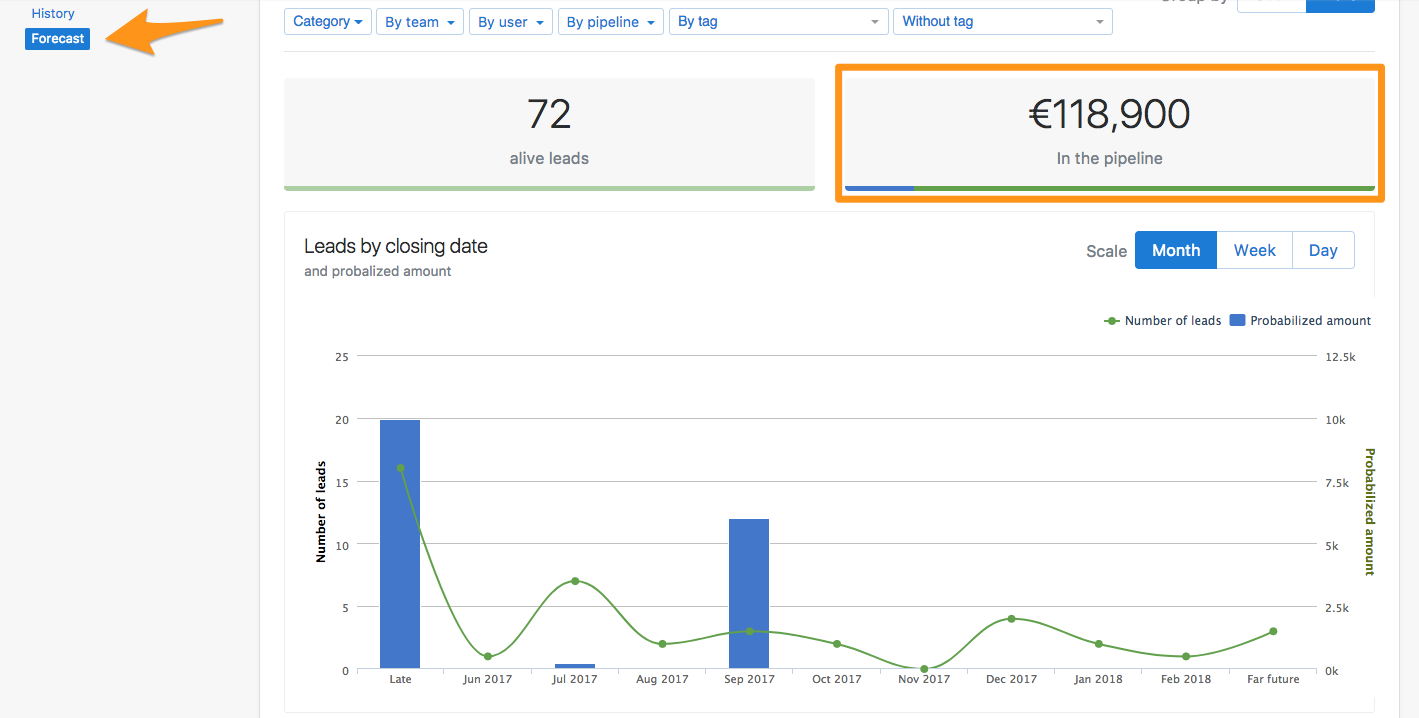 The Forecast report enables you to know how much money you have in the pipeline and the predicted incoming revenue in the upcoming months. It also provides you with the weighted value according to the probabilities you set in your leads.