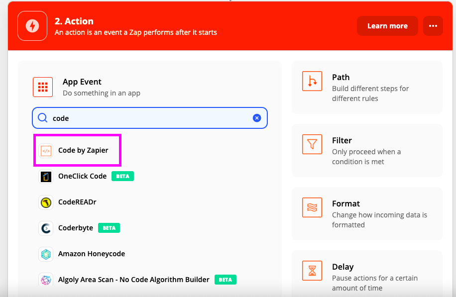 1. Seleziona l'App dell'Action: Code by Zapier