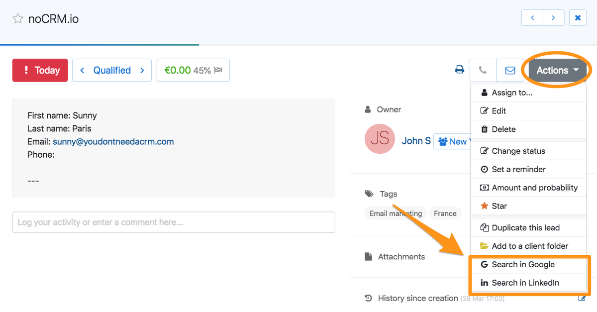 Apri la tua opportunità commerciale e avvia la ricerca dal menù Azioni. Facile!