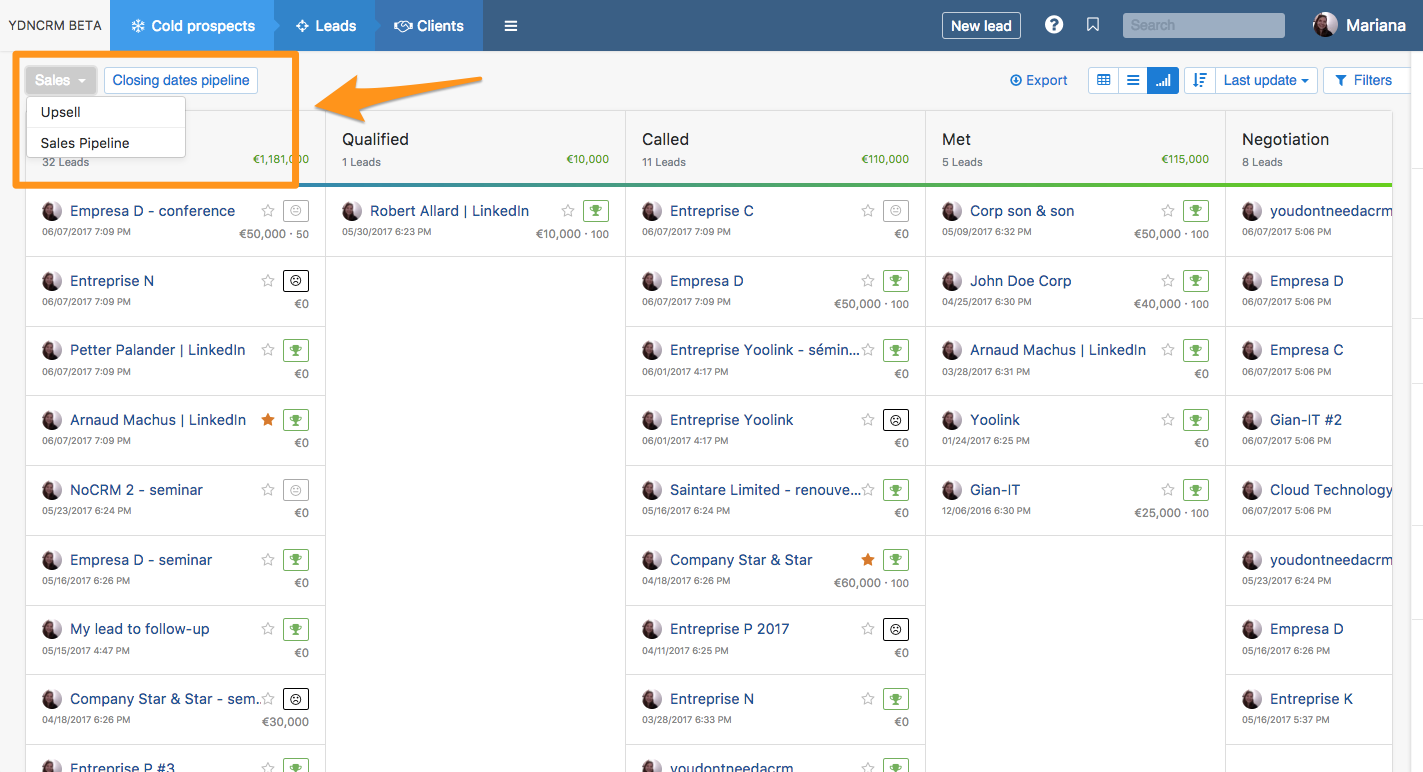 Questa funzionalità è disponibile nelle Edizioni Esperto e Dream Team e permette di pianificare e gestire diverse pipeline alla volta. In effetti, non solo il processo di vendita cambia da un'azienda all'altra, ma cambia molto da un servizio all'altro o da un prodotto all'altro. Così per le aziende che hanno diversi processi di vendita perché vendono diversi tipi di prodotti o servizi, è un'ottima funzionalità!