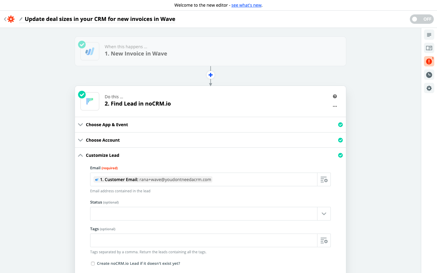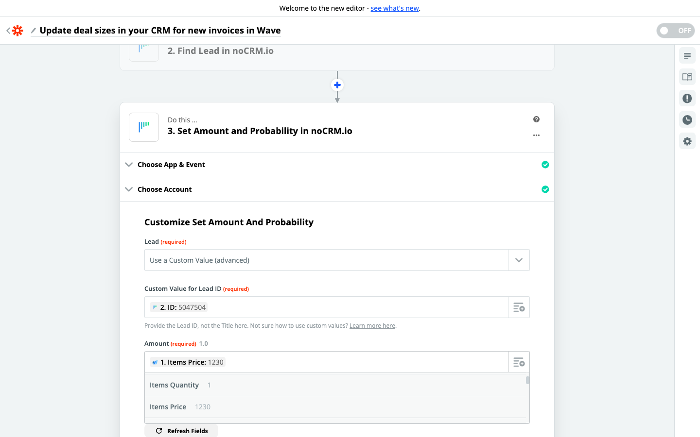 Questa guida illustra come puoi aggiornare l'importo delle opportunità commerciali in base alle fattura create in Wave Accounting