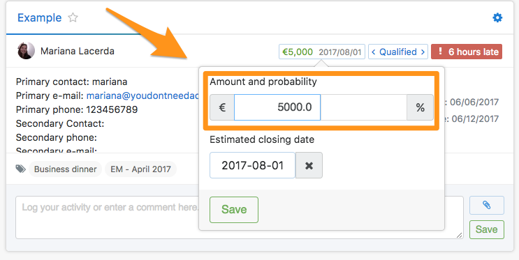 Puoi impostare l'importo e la probabilità di ogni opportunità commerciale cliccando sul tasto 'Impostare importo e probabilità'. L'importo e la probabilità sono molto importanti per le previsioni e per filtrare le opportunità commerciali, quindi questa funzionalità è molto utile. Una volta che l'importo è impostato puoi modificarlo cliccando su di esso.