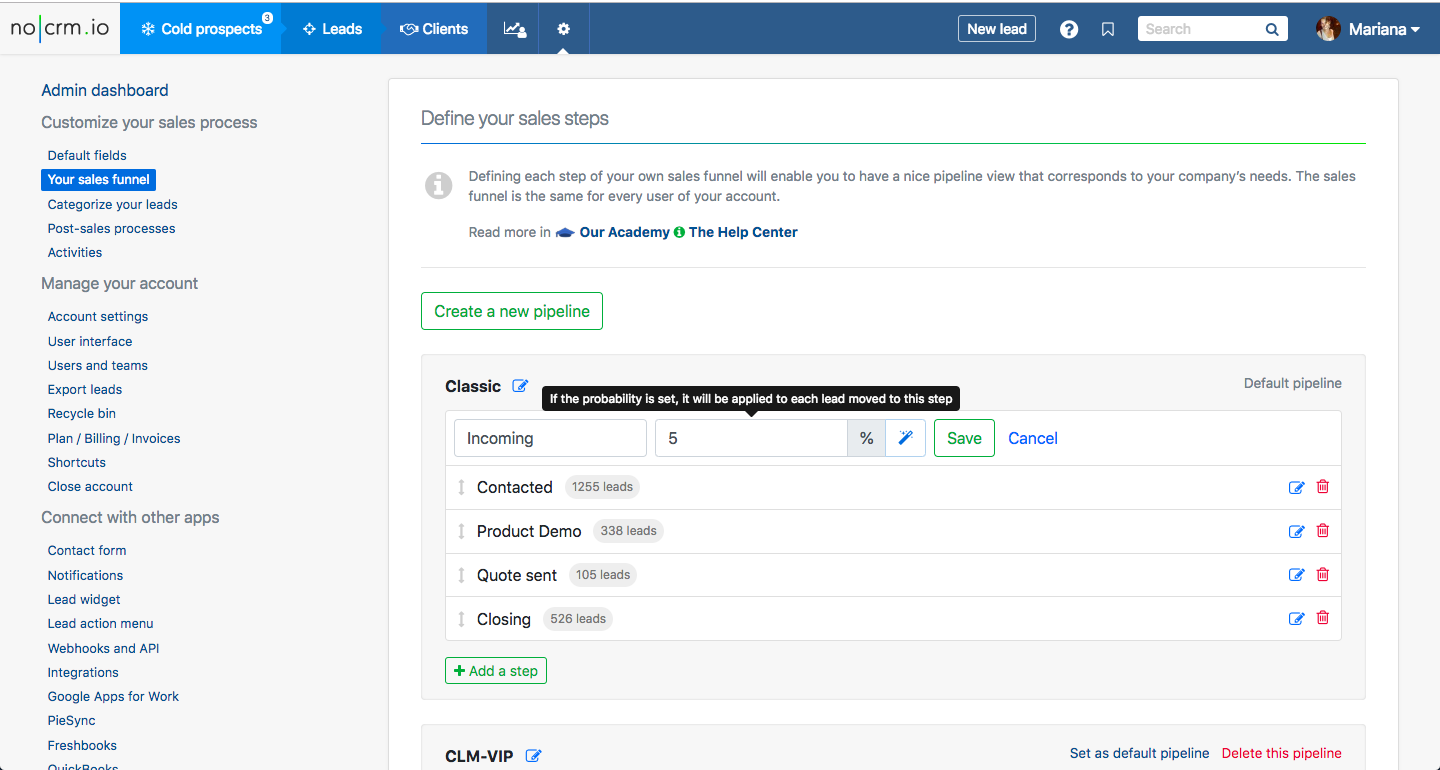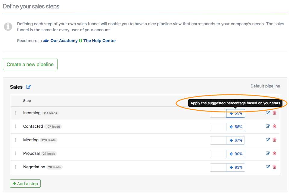 Se stai già usando propipelines.com, basta modificare lo step per definire la probabilità di default. E in base alla cronologia delle tue opportunità commerciali ti proponiamo una percentuale per ogni step di vendita!