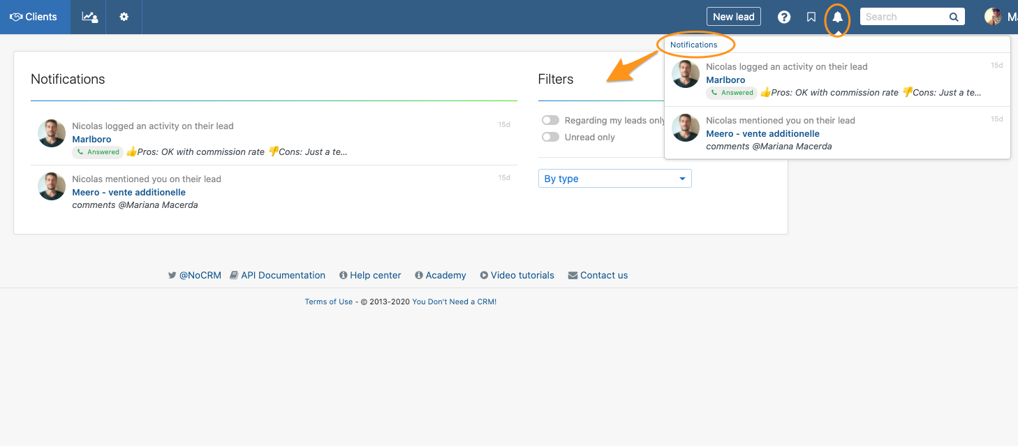 Le notifiche sono importantissime per assicurarti di non dimenticare un follow-up, un'opportunità e sapere quando qualcuno interagisce con te o con uno dei tuoi lead.