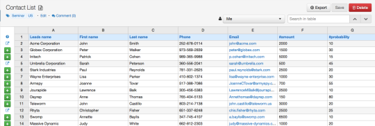 Gli agenti di commercio hanno bisogno di qualcosa di simile a Excel con un foglio elettronico integrato online che gli permette di chiamare i prospect, di aggiungere commenti e altre importanti informazioni e di avere uno strumento più potente quando si rivelano essere vere opportunità commerciali. Tutto in un unico posto.