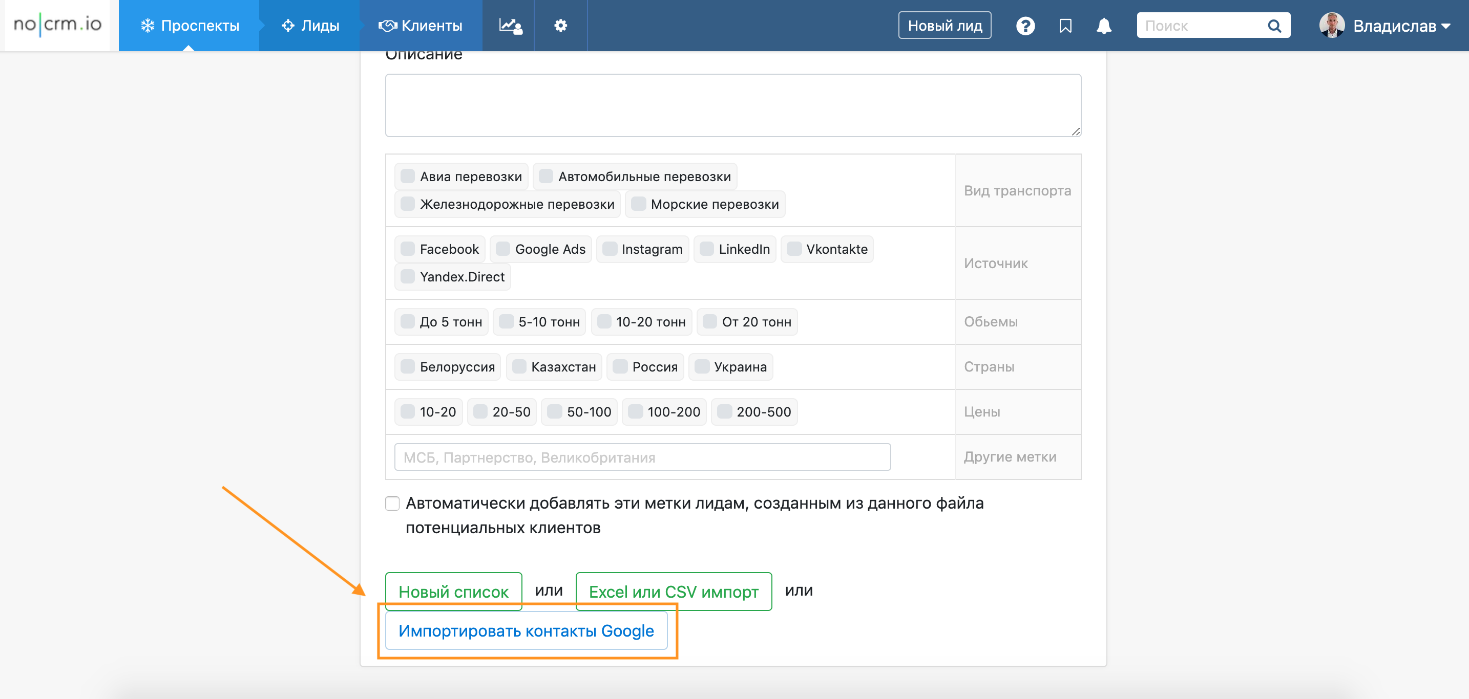Создайте новую Базу контактов и нажмите кнопку Импортировать контакты Google.