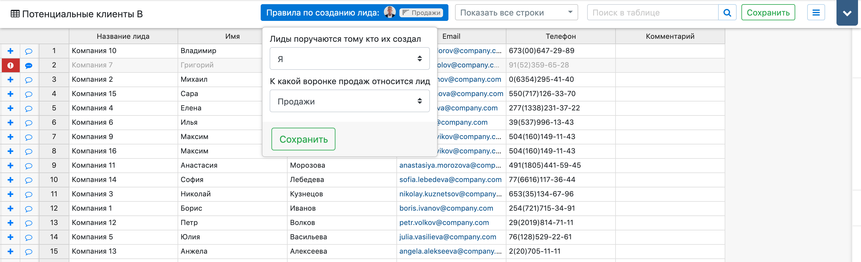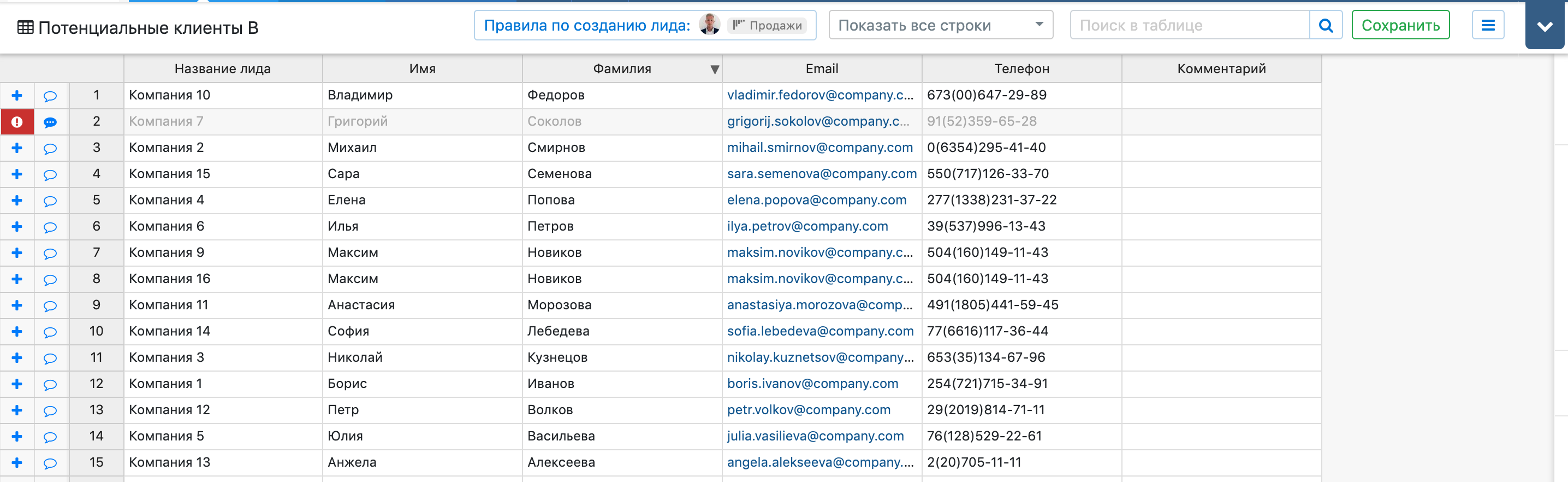 Обратите внимание на то, что первый столбец будет использоваться в качестве названия лида при его создании.