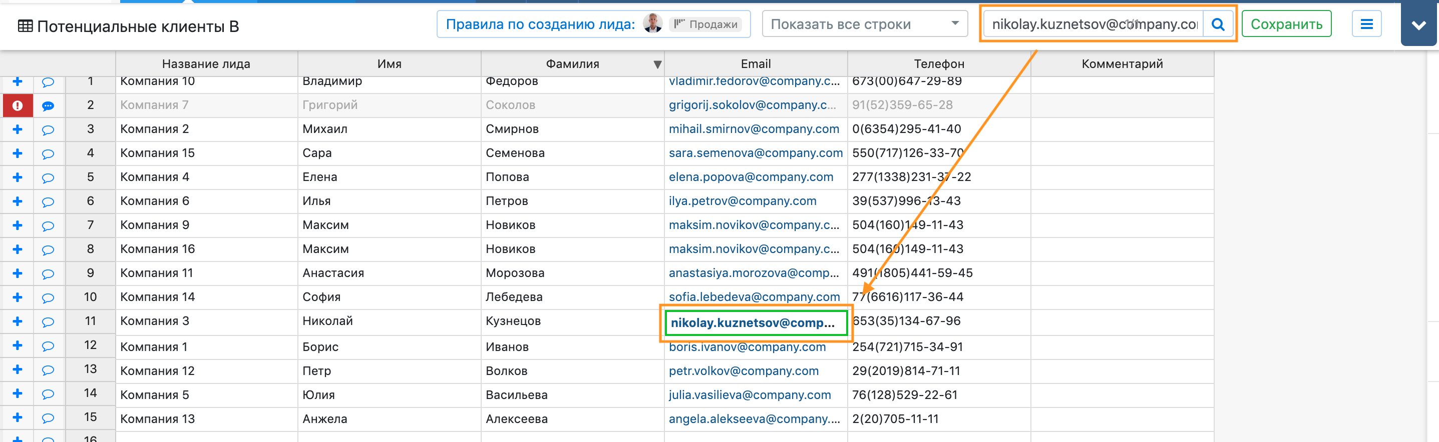 После создания лида, строка в списке контактов становится полностью независимой от него: если вы обновите информацию о компании, она не будет обновлена в списке контактов.