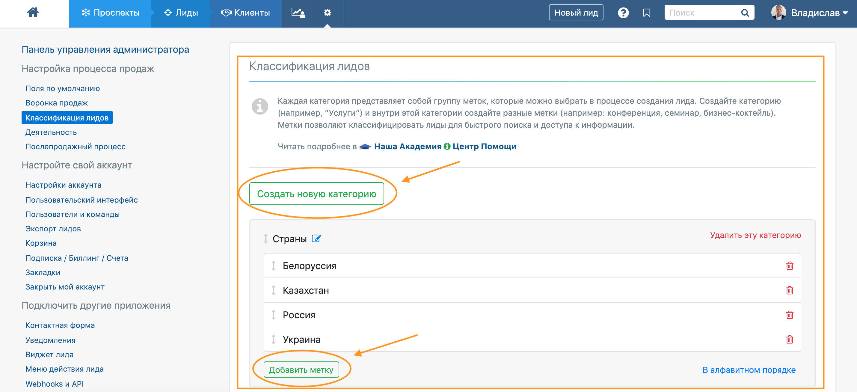 Чтобы создать категории и теги : Панель Администратора > Классификация лидов.