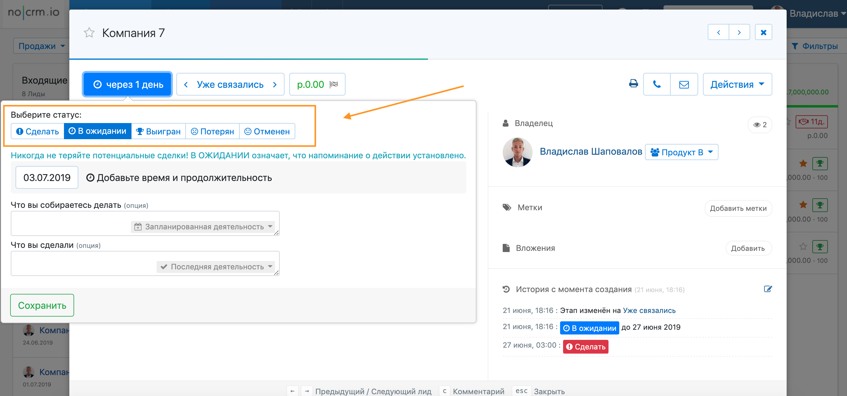 Пока лид не закрыт, либо вам нужно над ним работать прямо сейчас («статус Сделать»), либо вам нужно будет работать над лидом в предопределенный день и время («статус В ожидании»).