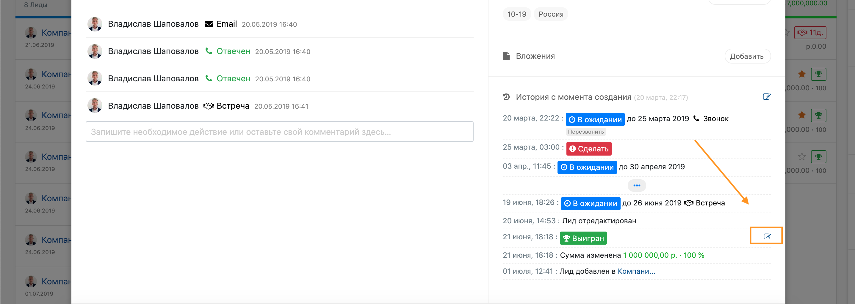 У вас есть возможность отредактировать дату выигрыша ваших лидов. Чтобы отредактировать дату, откройте карточку лида и на правой боковой панели, в «истории лида», вы увидите значок карандаша для редактирования информации.