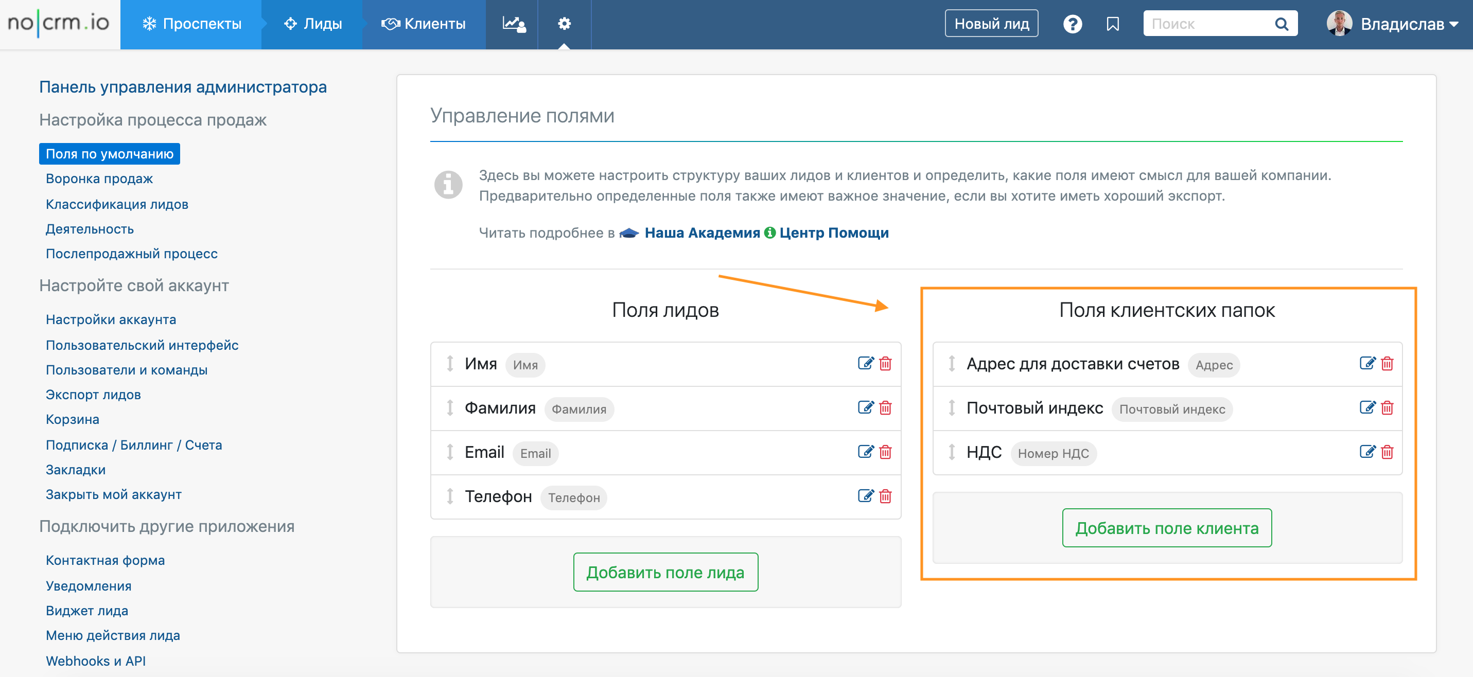По примеру полей по умолчанию для создания лидов, у вас есть структура полей для папок клиентов.