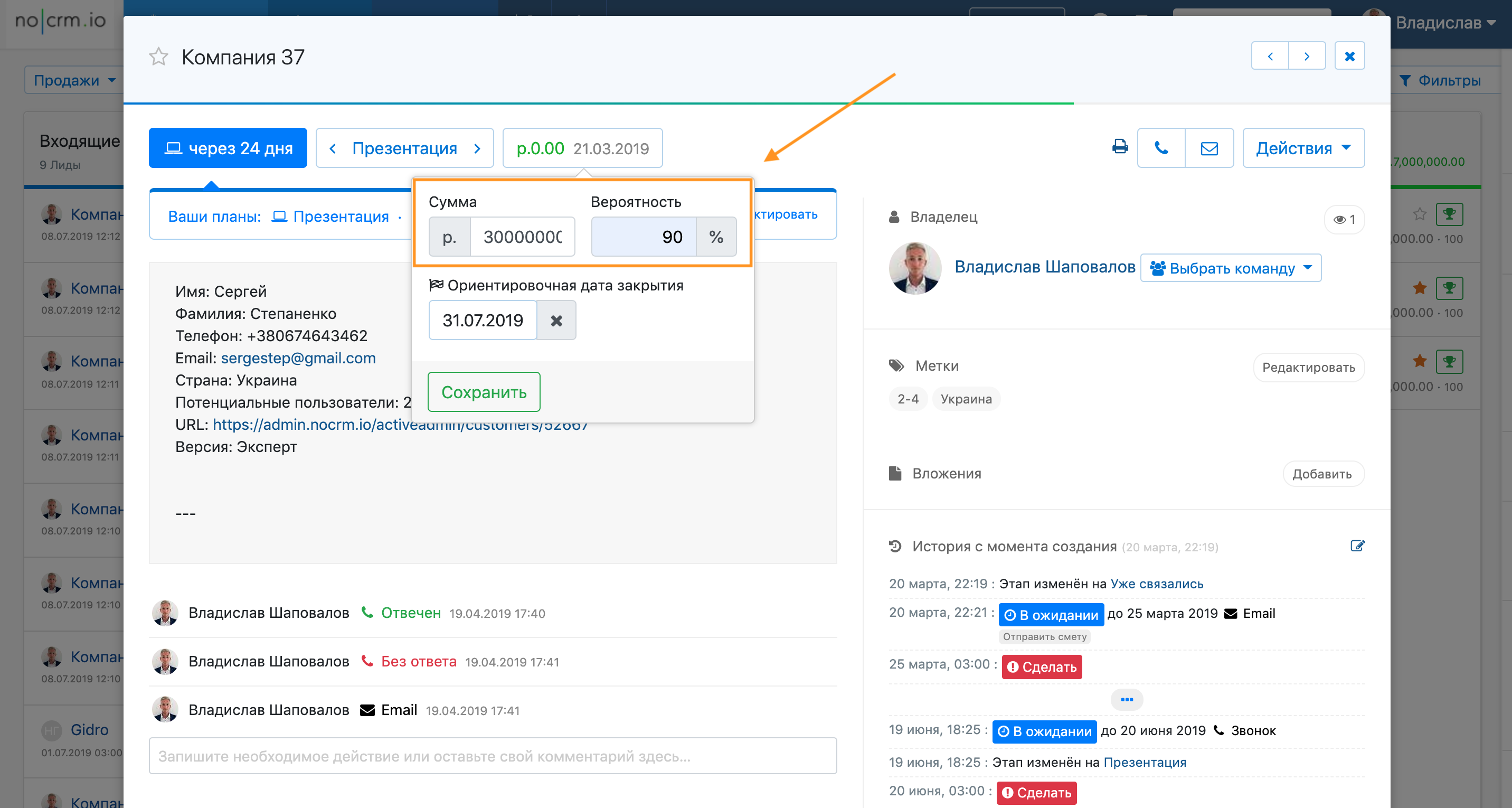 Вы можете установить сумму и вероятность для каждой сделки, нажав на кнопку «Сумма» в карточке лида. Сумма и вероятность очень важны для прогнозирования. Как только сумма установлена, вы можете изменить ее, повторно щелкнув по ней.