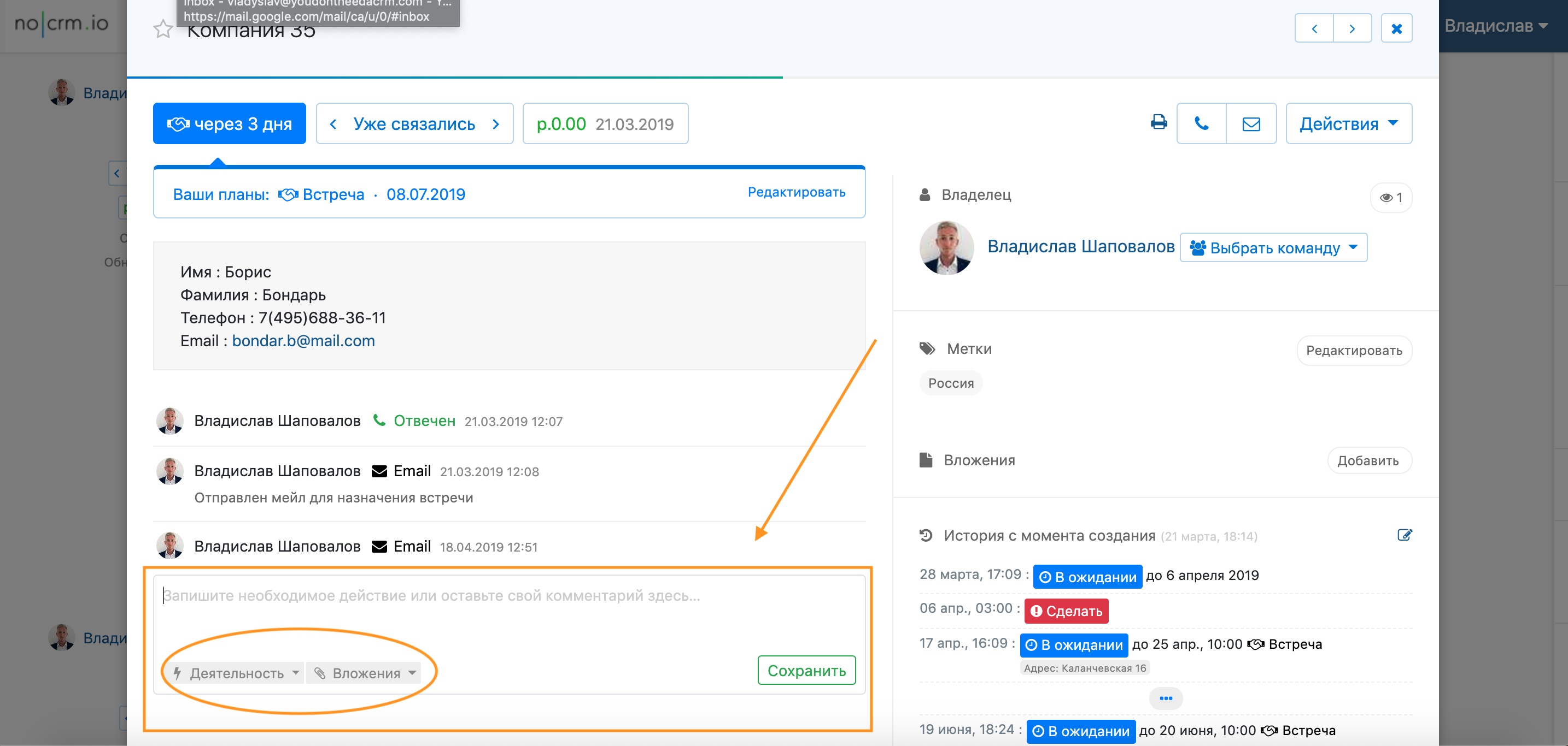 Для этого есть поле «комментарий» внизу каждой карточки лида. Вы также можете использовать поле для комментариев, для передачи информации своим коллегам, давая им советы или задавая вопросы. Также, вы можете выбрать деятельность или прикрепить вложение.