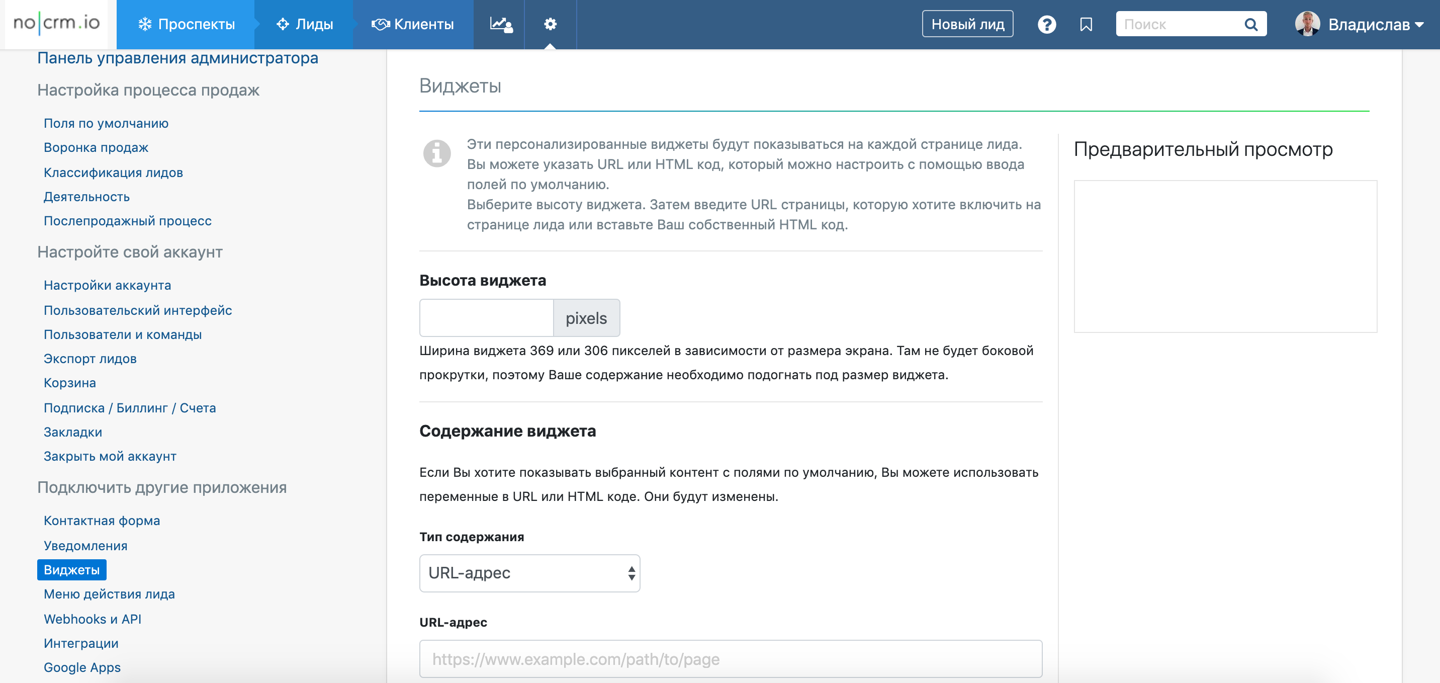 В propipelines.com администраторы могут создавать свои собственные HTML-виджеты для передачи информации всей команде, например, встречи по продажам или цели продаж за этот месяц. Также, через виджеты можно отражать внешнюю информацию, например из определенного веб-сайта.